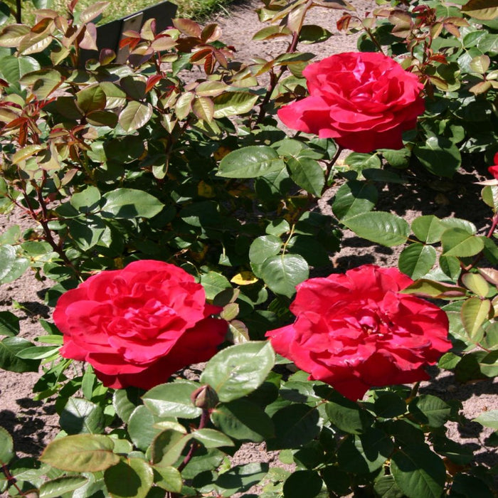 The Leibeszauber rose, also known as the Love's Magic rose, is a stunning hybrid tea rose variety. It features large, vibrant red blooms with a velvety texture, making it a popular choice for romantic-themed gardens and floral arrangements.